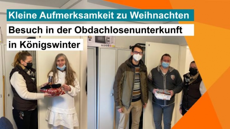 Wir haben heute den Bewohnerinnen und Bewohnern der Obdachlosenunterkunft in Königswinter ein paar Kleinigkeiten zu Weihnachten vorbeigebracht. Gerade in der Weihnachtszeit gilt es als Gesellschaft solidarisch zusammenzuhalten und diejenigen zu bedenken, die schlimme Schicksalsschläge erlitten haben.