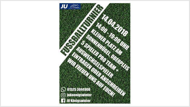 Am Samstag, 14. April, 14:00 – 19:00 Uhr veranstaltet die JU ein Fußballturnier auf dem kleinen Platz an der Grundschule Sonnenhügel in Oberpleis. Es spielen 5-Mann-Teams und wer mitkicken möchte, kann sich noch anmelden.